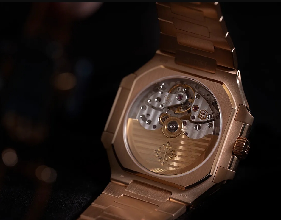 In terms of finissage, standards are high as usual. Visible through the sapphire crystal case back are Geneva waves on bridges, polished bevels and screw heards, perlage, and gold-filled engravings. The obvious difference in finishing seen on the Calibre 26-330 S C compared to other Patek calibres has to do with the surface of the gold central rotor. The horizontal motif here is in stark contrast to the more commonly utilised circular waves. This design – specific for the Cubitus – complements the model’s heavy use of lines and angles and is reminiscent of its embossed dial.