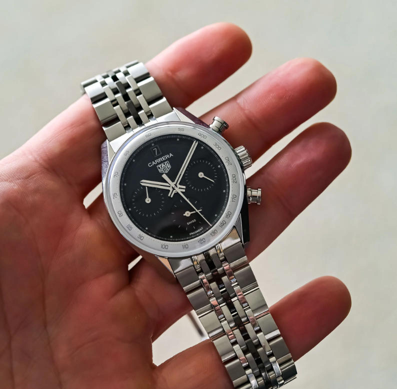 In hand, the 39mm stainless steel case immediately reveals the cool and stylish Glassbox concept. There’s no external bezel, as the highly domed sapphire crystal rises fluidly from the case edge and merges into the tachymeter flange beneath. From the side, it feels like a single continuous curve of steel and glass, an unbroken silhouette. The angular lugs are sharp and faceted, extending cleanly from the midcase in true Carrera fashion. Measuring 13.9mm thick, it’s not the slimmest chronograph, but the proportions are balanced, and the crystal’s shape visually lightens the 1:1 fake watches UK.